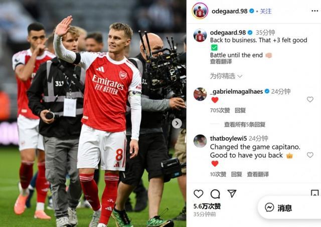 9月29日讯 阿森纳在本轮英超2-1绝杀逆转纽卡,赛后,厄德高更新了社交媒体。