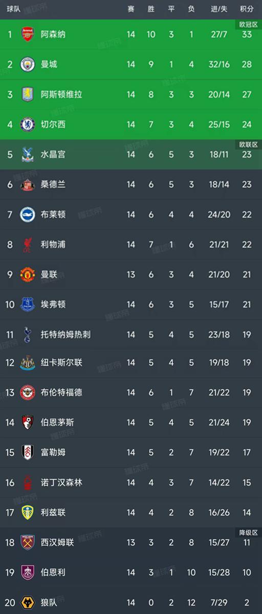 英超最新积分榜
